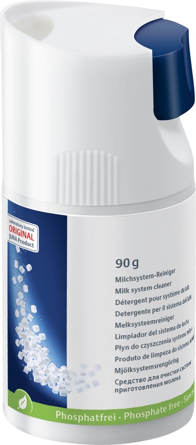 Håll din automatiska kaffemaskin ren från proteiner och mjölkfett med JURA rengöringstabletter för mjölksystem 90 g 24158. Förpackningen innehåller 30 fosfatfria tabletter och en påfyllbar flaska.