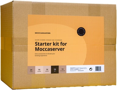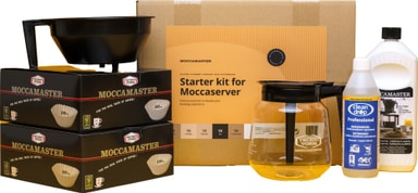 Moccamaster Moccaserver startkit innehåller kaffefilter, en filterhållare, en glaskanna samt rengörings- och avkalkningsprodukter.Läs mer om produkten
