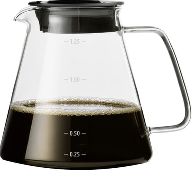 Melitta glaskanna MEL22768, designad för Melitta One-kaffebryggare, rymmer 1,25 liter och har mätmärken, ett säkert lock och ett robust glashandtag för enkel upphällning.