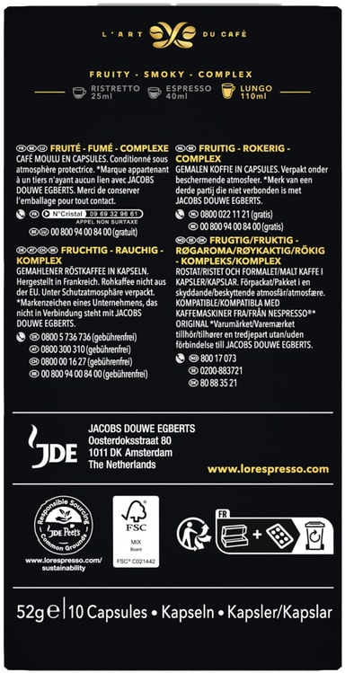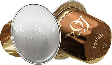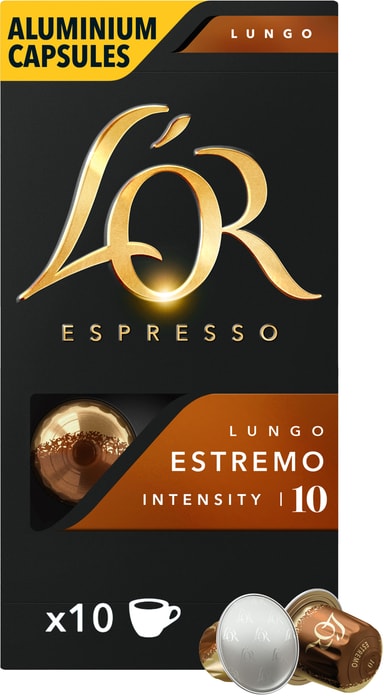 L'Or Lungo Estremo kapslar LOR4028607 skapade av L'Or Coffee Artists ger dig en fruktig och rökig kopp 10-intensitetskaffe med ett lätt inslag av vanilj. Aluminiumkapslarna är kompatibla med Nespresso* kaffemaskiner.