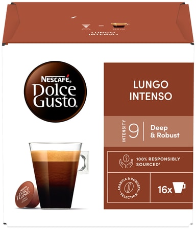 Stark och lång -- finns det någon bättre kombination när det kommer till välsmakande kaffe? Ta en stund när som helst på dygnet och njut av våra Lungo Intenso-kapslar. Istället för att göra en espressoshot, leds tillräckligt med varmt vatten för att fylla en vanlig kaffekopp genom det rostade och malda kaffet. Resultatet: en rik och smidig äkta italiensk kaffekapsel som du kan ta dig tid över. Ingredienser: Malen rostad arabica och robusta kaffe. Denna förpackning innehåller 16 kapslar NESCAFÉ Dolce Gusto Lungo Intenso-kapslar och det är Dolce Gusto-maskinkompatibla kapslar. Ingredienser: Kaffe (100%).