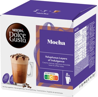 NESCAFÉ Dolce Gusto Mocha Kaffekapslar, vår krämiga och söta choklad med en hint av premium Arabica-kaffe. Kombination av läckra kakaotoner med krämig mjölk och en touch av fina aromatiska kaffetoner.Läs mer om produkten