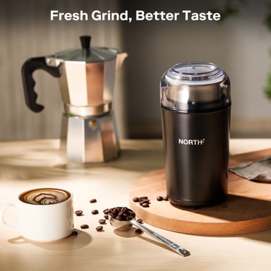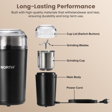 North kaffekvarn 205108 har en kraftfull 200W motor som mal med upp till 25 000 varv per minut för snabba och precisa resultat. Den löstagbara koppen och bladet i rostfritt stål gör rengöringen enkel, medan den manuella malningskontrollen låter dig välja önskad textur. Kompakt, säker och byggd för att hålla länge, är den ett utmärkt val för kaffeälskare.