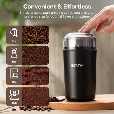 North kaffekvarn har en elegant och kompakt design med en modern svart kropp i ABS-plast som passar perfekt i alla kök. Den minimalistiska designen är både stilren och praktisk, vilket gör den lätt att förvara och använda dagligen.