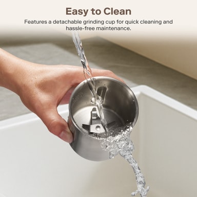Kvarnen levereras med en 100g malningskopp i rostfritt stål, perfekt för att mala flera koppar färskt kaffe på en gång. Oavsett om du brygger för dig själv eller har gäster, har den kapacitet för dina behov.