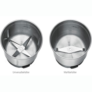 Inklusive: 2 utbytbara behållare i rostfritt stål, kapacitet 70 g: kvarnkopp med 2-vingat blad av rostfritt stål, universalkopp med 4-vingat specialblad av rostfritt stål, kaffeskopa med rengöringsborste