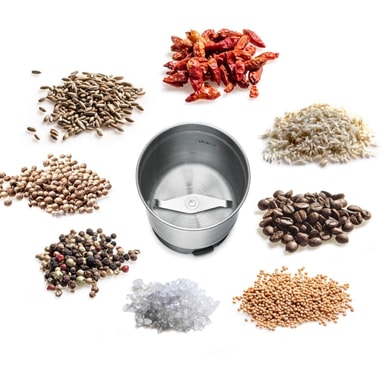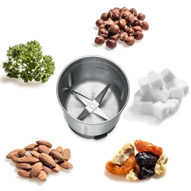 I kvarnkoppen produceras nymalet kaffe. Torkade örter, kryddor, socker, nötter och spannmål kan hackas och malas på nolltid. Den universella koppen är perfekt för att hacka färska örter eller förbereda en liten portion färsk pesto.