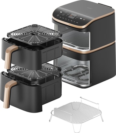 Den eleganta svarta designen på denna höga airfryer passar in i alla köksinredningar. Det staplade systemet sparar bänkutrymme, medan den lilla displayen och de interaktiva knapparna på toppen gör den enkel att hantera.