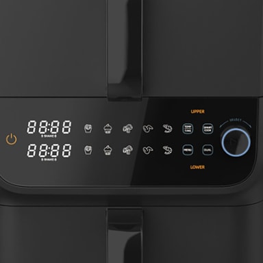 Utrustad med två korgar: 3,5L och 6,5L, är air fryern perfekt för att tillaga olika maträtter samtidigt eller laga större portioner. Den dubbla designen ger flexibilitet och tidsbesparande matlagning.