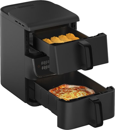 Varje korg har ett eget värmeelement, så du kan laga mat med olika inställningar samtidigt. Synkfunktionen ser till att båda korgarna blir klara samtidigt, även om tillagningstiderna är olika.