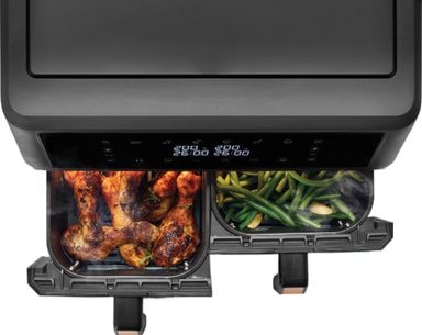 2400W F&B Dual Zone airfryer 72925 har en kapacitet på 11 l och kommer med 8 förinställda program för fritering, stekning och bakning. Fritösen har dubbla 5,5 l korgar för samtidig tillagning och en LED-pekskärm för inställning av temperaturen.Läs mer om produkten