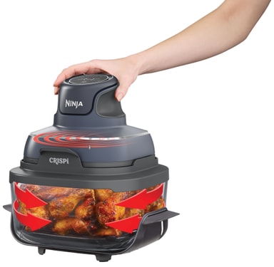 Ninja Crispi har en kompakt, modern design som passar bra på alla köksbänkar. Den är byggd för att vara portabel, med en lätt PowerPod som enkelt fästs på matlagningsbehållarna. Det genomskinliga glaset låter dig övervaka maten medan den tillagas.