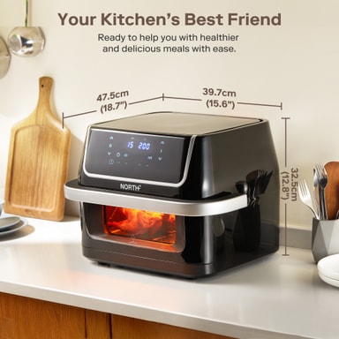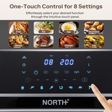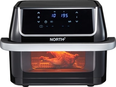 1800-watts North airfryer 205004 har en kapacitet på 10 liter med dubbla korgar för samtidig tillagning. Dess synkronisering säkerställer att båda korgarna tillagas samtidigt. Välj mellan 8 matlagningsfunktioner för att njuta av olika recept.Läs mer om produkten