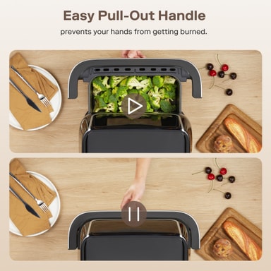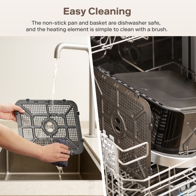 Fritösen har 2 frityrkorgar och ett glasfönster, så att du kan se din mat lagas i realtid. Både stekkorg och galler har en non-stick beläggning och tål diskmaskin för enkel rengöring.