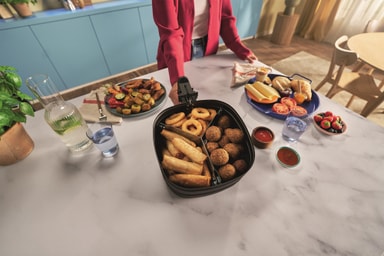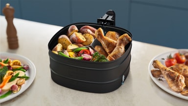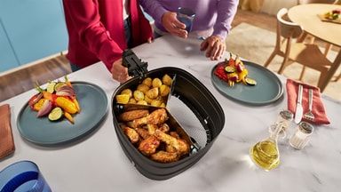 Philips korgavdelare HD9916/00 för Philips airfryer 8.3 l delar upp fritösen i tre sektioner, vilket gör att du kan laga flera rätter samtidigt. Den är kompatibel med HomeID-appen för receptinspiration och tål maskindisk för enkel rengöring.