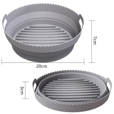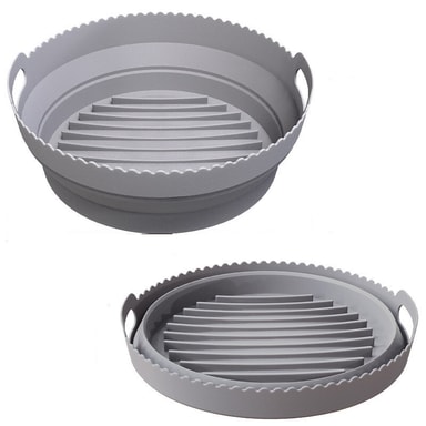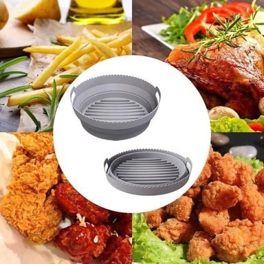 Rund form av livsmedelsgodkänt silikon. Den passar perfekt in i fritösen och förhindrar klibbiga och fastbrända matrester i din Air Fryer. Behållaren är återanvändbar och kan diskas i diskmaskin. Den upphöjda kanten håller maten på plats och fångar upp smulor och överflödigt fett. Formen kan tryckas ihop så den tar mindre plats när den inte används.