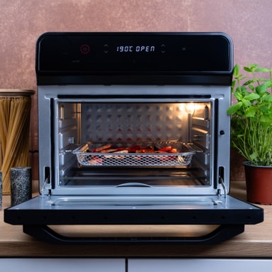 Luftfritösen på 1800 W har en kapacitet på 24 liter som är tillräckligt stor för att rymma familjemåltider eller satsvis matlagning för veckoförberedande måltider.