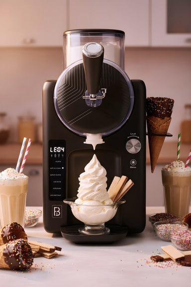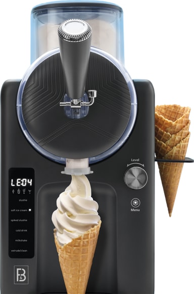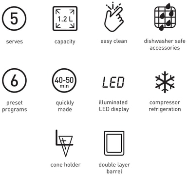 Denna kompakta maskin passar perfekt på din köksbänk. Den har indikatorlampor som visar när din frysta dessert är klar, ett visningsfönster och en praktisk tryck-dra-dispenser.