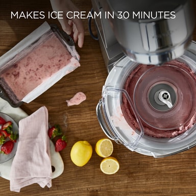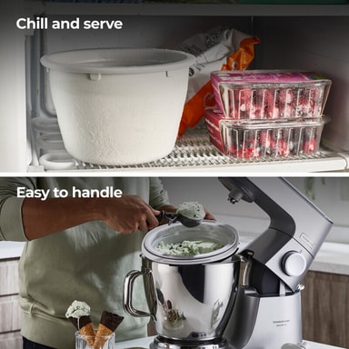 Kenwood glassmaskin KAX71.000WH låter dig tillaga upp till 1 liter frysta desserter hemma, perfekt för fester, sammankomster eller en snabb söt efterrätt. Den passar i vanliga fryslådor och fungerar med Kenwoods köksmaskiner.Läs mer om produkten