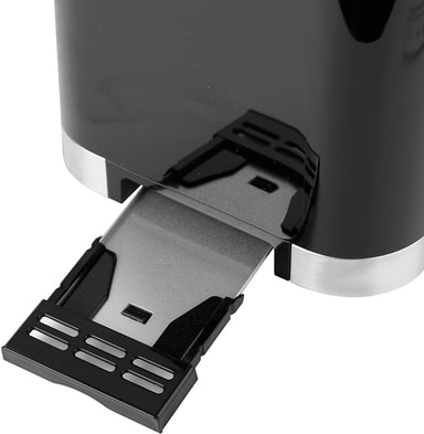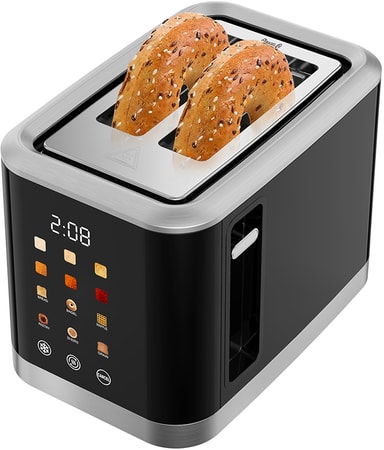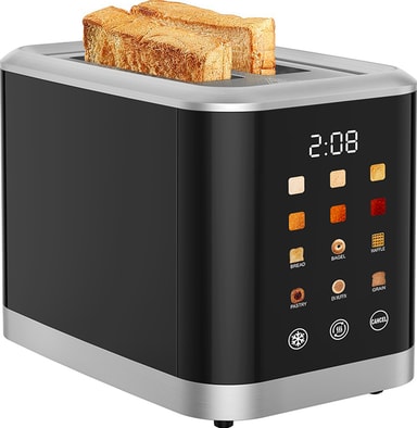 Brödrosten har en elegant svart finish, digital display med touchkontroller och kompakta fack för två skivor. Den är tillverkad av BPA-fria material i alla ytor som kommer i kontakt med mat för garanterad säkerhet. Gummifötterna säkerställer att den står stabilt under användning.