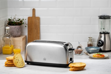 Praktisk brödrost i rostfri design från OBH Nordica med plats till fyra skivor bröd och High rise-funktion.Läs mer om produkten