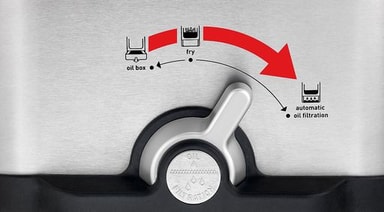 Fritösen har en automatisk oljefiltrering. När du är klar med friteringen, stänger du av fritösen och vrid strömbrytaren till ”automatisk filtrering”. När oljan kyls ned, skickas den genom en sil och tömms i oljebehållaren under, så att du kan använda den igen.