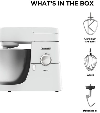 Köksmaskin Kenwood Chef XL KVL4100W har en 1200W motor och en stor 6,7-liters skål i rostfritt stål, lämplig för vardaglig matlagning och bakning för hela familjen. Den inkluderar K-vispar, ballongvisp, degkrok och stänkskydd, använder planetarisk blandning för jämna resultat och kan utökas med över 25 tillvalstillbehör.