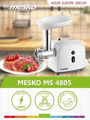 Dessutom ingår ytterligare tillbehör som en kolv och ett korvfyllmedel i uppsättningen. Kvarnen kan användas i båda riktningarna. Köttkvarnen Mesko MS 4805 har 1500W i effekt.