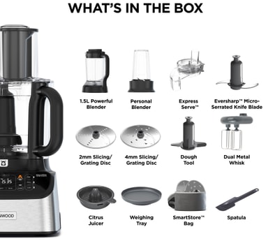 1000W Kenwood MultiPro OneTouch matberedare FDM73.850.SS gör mer än att bara hacka grönsaker. Den innehåller 6 förinställda program, flera tillbehör och 3 hastighetsinställningar, samt en pulsfunktion för att bli din mångsidiga kökshjälp.Läs mer om produkten