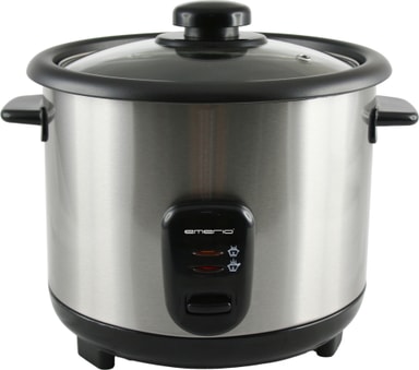 Emerio Riskokare Rostfri 1,5l Snyggt designad riskokare med en kapacitet på 1,5 liter. Riskokaren stängs av automatiskt. Effekt på 500W gör att pannan blir fort varm och riset kokt på ett snabbt och korrekt sätt. - Innehåll: 1,5 L - Rostfritt hölje - Inner panna med non-stick beläggning - Avtagbar innerpanna - Varmhållningsfunktion - Skydd mot torrkokning - Sked medföljer - Vattenmått - Anti-glid fötter - Strömindikeringslampa - Effekt: 500 Watt