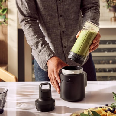 Gör enkelt smoothies eller mixa fryst mat med sladdlösa KitchenAid Go blender 5KSBR200BM. Den drivs av ett uppladdningsbart 12V litiumjonbatteri (säljs separat) och erbjuder upp till 20 minuters kontinuerlig drifttid. Kannan på 473 ml har ett resevänligt lock.