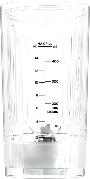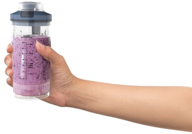 Den bärbara muggen rymmer upp till 570 ml, med en maxfyllningslinje på 490 ml. Det är en idealisk storlek för personliga smoothies, shakes eller såser, med ett läckagesäkert lock som förhindrar spill när du är på språng.
