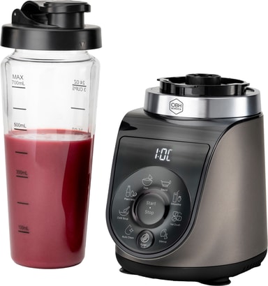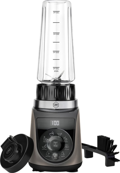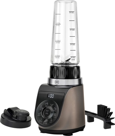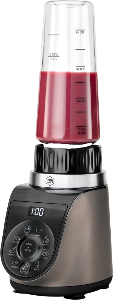 OBH Nordica Blend-Up blender LH190EN0 är en kompakt, 1000W mixer med 8 förinställda program för smoothies, soppor, dipsåser och mycket mer. Den mixar direkt i en 700 ml flaska med dricklock, vilket gör den perfekt att ta med sig. Ett smart låssystem garanterar säkerheten och en automatisk rengöringsfunktion förenklar städningen.
