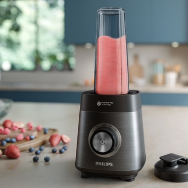 Philips 5000-seriens mixer HR3041/00 är designad för att förenkla måltidsförberedelser i köket. Den är utrustad med en kraftfull 1200W motor som enkelt kan blanda tuffa ingredienser som nötter, fryst frukt och grönsaker för att skapa smidiga puréer och soppor. Denna mixer använder en räfflad ProBlend Plus-burk för att blanda ingredienserna noggrant och underlätta korrekt cirkulation.