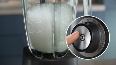Lätt att rengöra: Blandarens alla löstagbara delar tål diskmaskin för extra bekvämlighet. Enheten levereras också med ett rengöringsprogram med en knapptryckning. För att rengöra den, tillsätt bara varmt vatten och tvål i burken och aktivera rengöringsfunktionen.