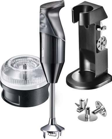 Denna kraftfulla och mångsidiga stavmixer kommer med flera olika blad och en matberedare, så att du kan krossa och blanda både våta och torra ingredienser.