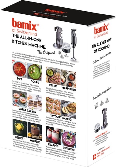 Bamix stavmixer är tillverkad i Schweiz med schweizisk signaturkvalitet. Alla tillbehör är gjorda av förstklassigt, rost- och luktfritt material som är säkert att använda.