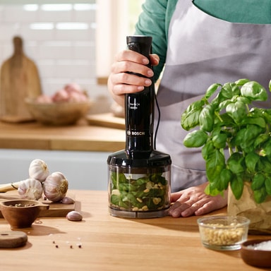 Utformad för att hantera vardagliga köksuppgifter kommer den 1000-watt starka stavmixern med en bägare och en 500 ml hackskål som passar de flesta mix-, hack- och blandningsbehov, perfekt för att tillreda allt från såser och soppor till smet och dressingar.