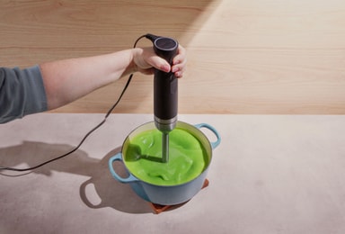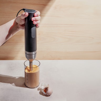 Den inkluderar två avtagbara mixerstavar designade för olika portionsstorlekar. Den mindre staven är perfekt för såser och emulsioner, medan den större staven hanterar soppor, smoothies och större satser med lätthet. Båda stavarna är repfria och säkra för non-stick köksredskap.