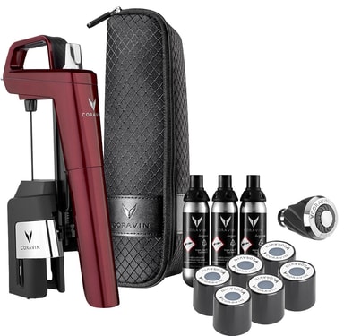 CoravinTimeless Six+ vinbevaringssystem 112336är idealiskt för sofistikerade vinälskare som vill spara halvfulla flaskor på ett bekvämt sätt. Med den patenterade Coravin-teknologin behöver du inte ta bort korken, bara för in systemet i flaskan, häll upp vinet och efter det kan du bevara flaskan tack vare speciella Coravin-kapslar. Systemet haräven luftare, skruvlock och en bärväska.