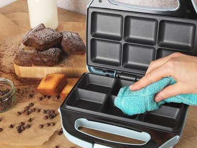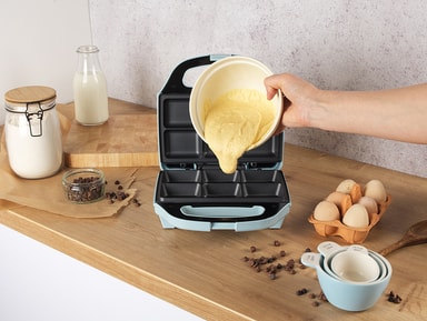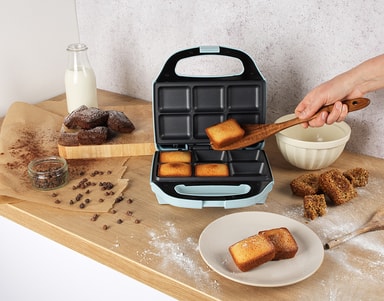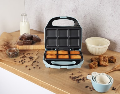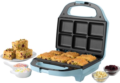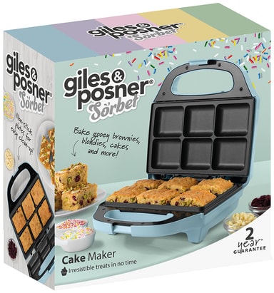 Denna kakmaskin har ett blått yttre med non-stick-belagd insida. Den kompakta designen gör att den enkelt kan förvaras eller flyttas runt i köket.