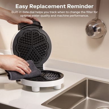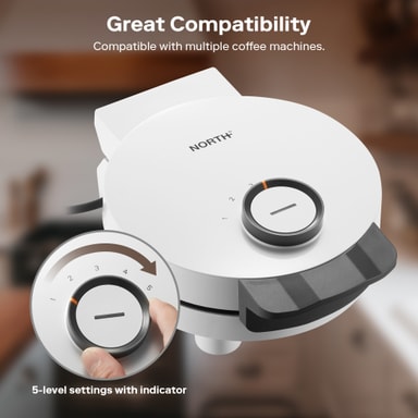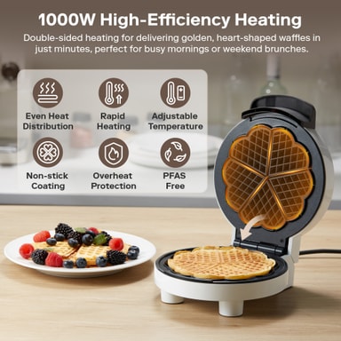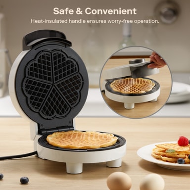 Detta våffeljärn har en kompakt design med en keramikbelagd platta för jämn tillagning och enkel rengöring. Dess värmeisolerade handtag och eleganta vita finish kombinerar säkerhet och stil, vilket gör den till ett trevligt tillskott i alla kök.