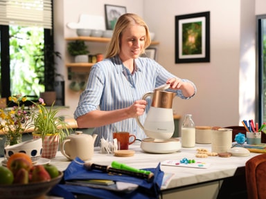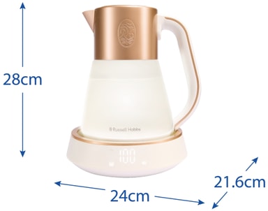 2400-watts Russell Hobbs Calm Kettle 27450-70 har en kapacitet på 1,7 liter och justerbar temperatur från 40 till 100°C. Dess frostade glaskropp och Quiet Boil-teknologin bevarar din drinks smak. Den har även en varmhållningsfunktion och automatisk avstängning för att förhindra överhettning.