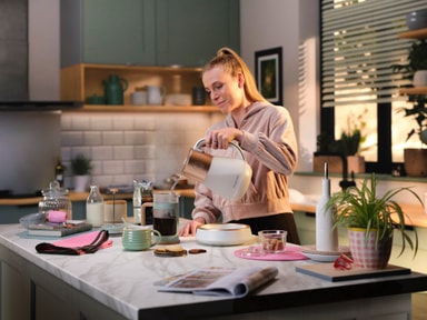 2400-watts Russell Hobbs Calm Kettle 27450-70 rymmer 1,7 liter och värmer från 40 till 100°C. Den har en kropp i frostat glas, Quiet Boil-teknik, en varmhållningsfunktion och automatisk avstängningsfunktion för snabb och bekväm uppvärmning.Läs mer om produkten