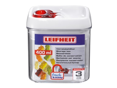 Fyrkantig hushållslåda med smart låsteknik i locket, som är mycket lätt att öppna och stänga med bara en hand. Lådorna är i genomskinlig plast med vitt lock har lufttät försegling och kan staplas. 0,4 liter. 10 x 10 cm.3 års garanti.Läs mer om produkten
