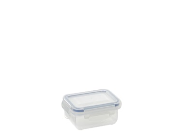 Förvaringsburk Funktion 160 ml, rektangulär, storlek 97 x 78 x 43 mm. Lufttäta förvaringsburkar med 4 clips och gummikant. Kan användas i mikrougn. Öppna alltid locket vid användning i mikkrougn. Tål frys. Tål maskindisk. Lätta att stapla.