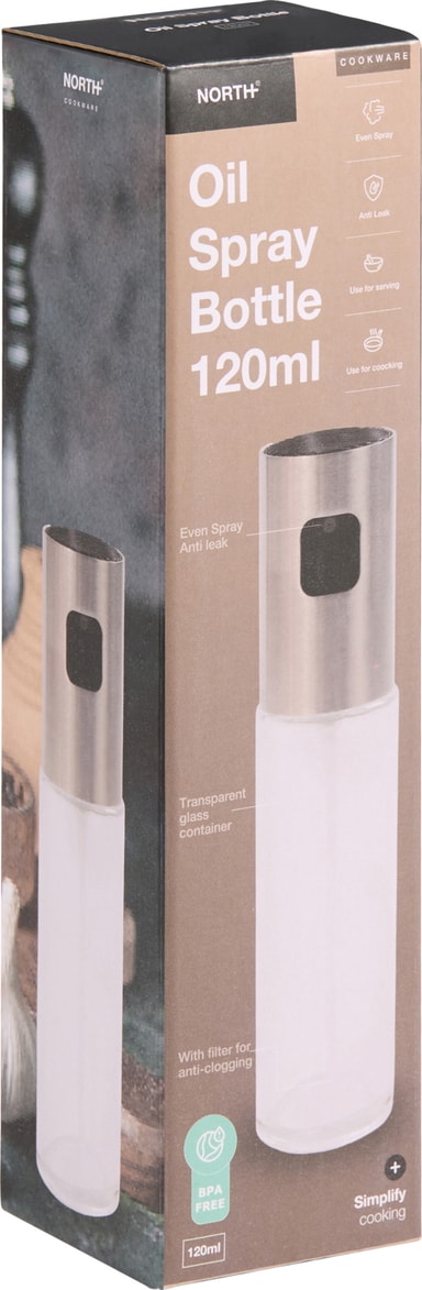 '120 ml North olje- och vinägerflaska 205202, perfekt för att spraya olja på pannor eller vinägrett på sallader. Läcksäkert munstycke med silikonringar, kyl- och diskmaskinssäker för lätt rengöring.'Läs mer om produkten