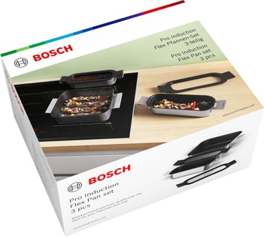 Bosch flexpannset HEZ9FF030 är lämplig för induktionshällar och i ugnen vid temperaturer upp till 220°C. Den har en slitstark 3-lagers non-stick beläggning. Smart designad för att enkelt staplas och förvaras.Läs mer om produkten