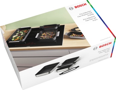 Bosch flexpannset HEZ9FF040 är lämplig för induktionshällar och i ugnen vid temperaturer upp till 220°C. Den har en slitstark 3-lagers non-stick beläggning. Smart designad för att enkelt staplas och förvaras.Läs mer om produkten