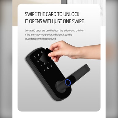 Mångsidiga upplåsningsmetoder: Upplev oöverträffad bekvämlighet med vårt smarta dörrlås mångsidiga upplåsningsalternativ. Lås enkelt upp din dörr med TTLock Bluetooth-appen, ditt unika fingeravtryck via den avancerade halvledarsensorn, ett säkert lösenord, NFC-teknik, ett fysiskt kort, en traditionell nyckel eller till och med ett tillfälligt lösenord för gäster. Denna flexibilitet säkerställer enkel åtkomst för dig och auktoriserade personer, vilket ger trygghet och eliminerar besväret med traditionella nycklar. Perfekt för familjer, uthyrning och företag som söker förbättrad säkerhet och bekvämlighet. Fingeravtrycksigenkänningen är snabb och exakt, vilket säkerställer att endast behöriga användare får tillträde. Njut av nyckelfri ingång och avancerade säkerhetsfunktioner med detta innovativa smarta lås.